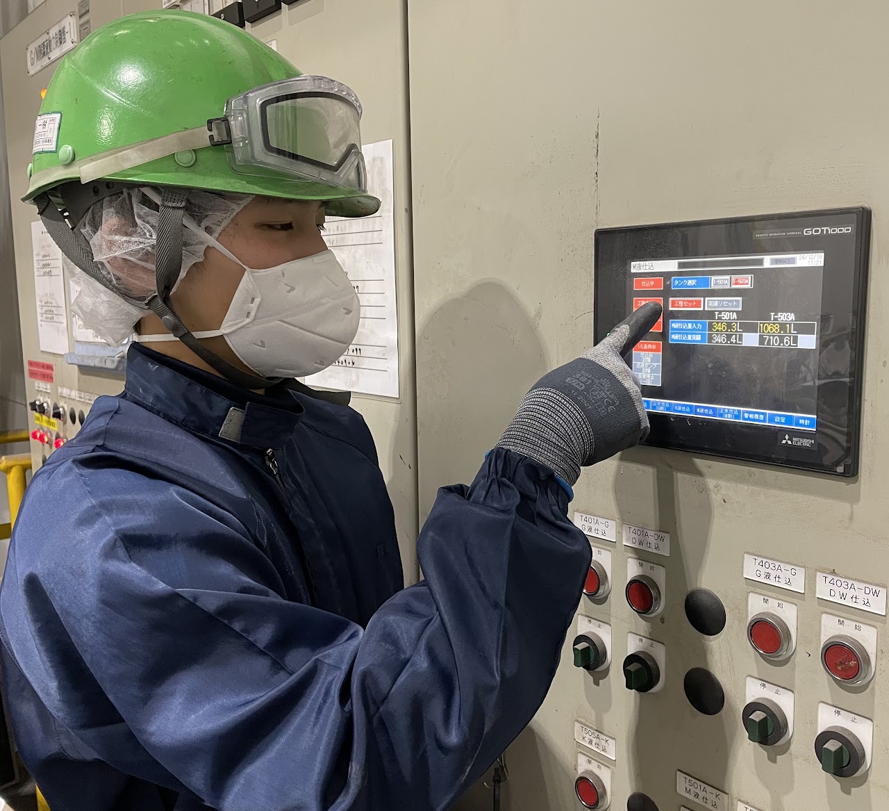脱酸素剤の中に入っている原末に添加する溶液を作製する調液作業を担当しています。調液作業の主な業務は、原末に求められる品質基準を満たすために原材料を正確な割合いで混合し、次工程に渡すことです。